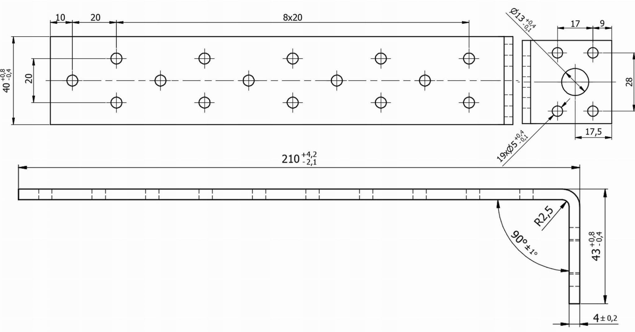 Wysokość wynosi 210 mm, szerokość 40 mm, długość podstawy 43 mm, a grubość blachy to 4 mm.