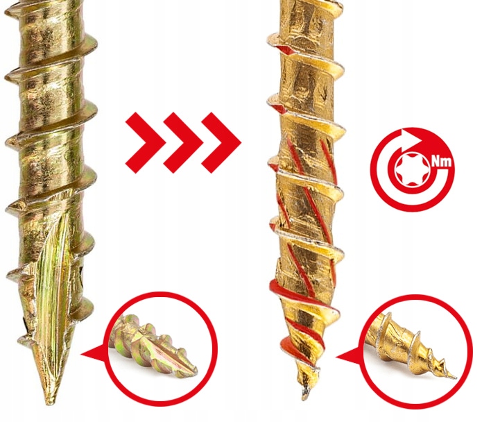 - Karby tnące: specjalne karby tnące na gwincie przecinają włókna struktury drewna podczas wkręcania.