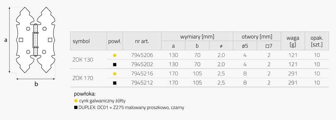 Zawias skrzyniowy szafkowy ZOK 130 to wysokiej jakości element montażowy przeznaczony do łączenia skrzydeł bram, furtek oraz okiennic z ich ramą. Wykonany został z materiałów odpornych na działanie niekorzystnych warunków atmosferycznych, co zapewnia jego długowieczność oraz niezawodność w użytkowaniu. Jego stylowe wykończenie w kolorze czarnym sprawia, że idealnie wpasuje się w różnorodne aranżacje, nadając im elegancki i rustykalny charakter.